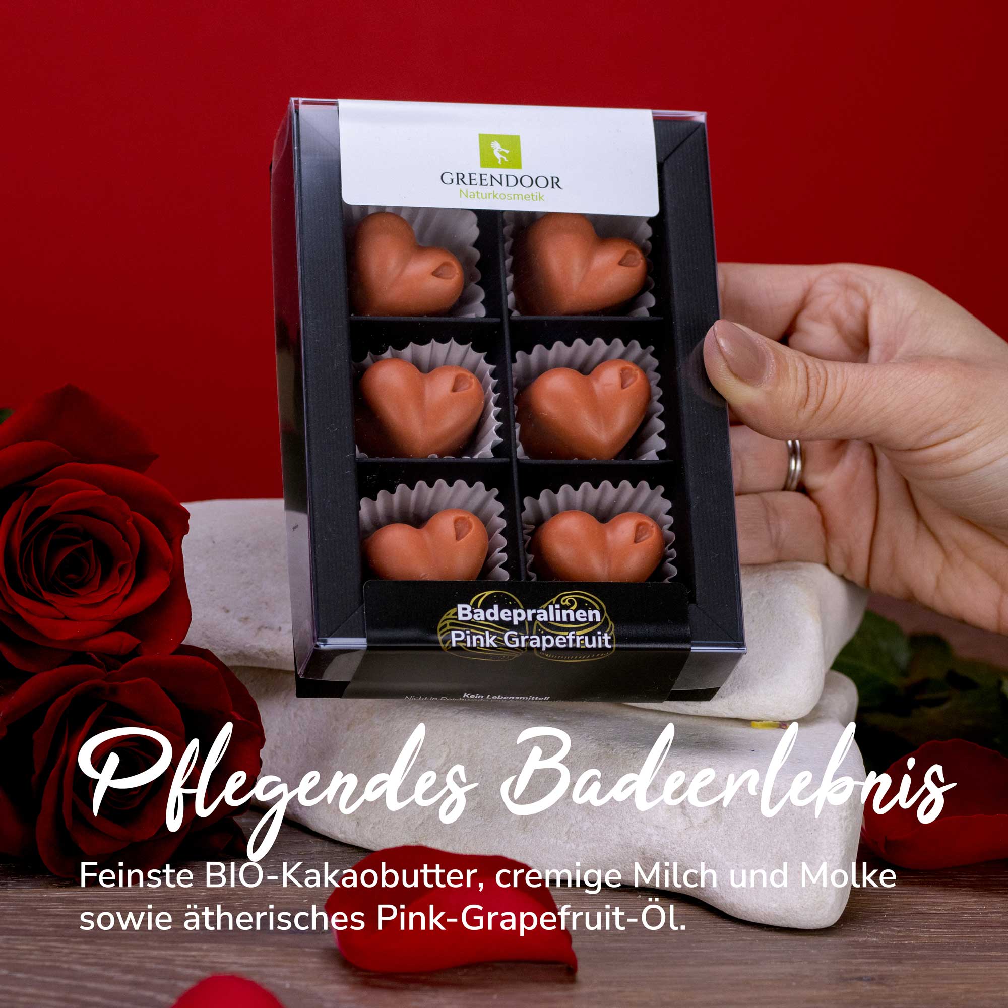 Unsere Greendoor Badepralinen Pink Grapefruit sind eine Komposition aus wertvoller BIO Kakaobutter, Milch und Molke und herrlich frisch duftendem ätherischen Öl frisch geernteter Pink Grapefruits.