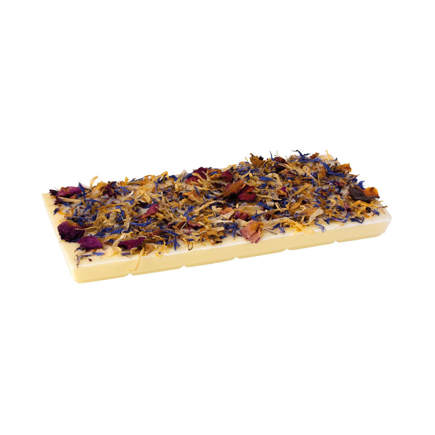 Die bunte natürliche Blütendeko aus Kornblumen, Damaszener Rosenblütenblättern und Ringelblumenblüten verleihen der Badeschokolade Blumenwiese ihr hübsches Aussehen und machen sich auch auf dem Badewasser gut.