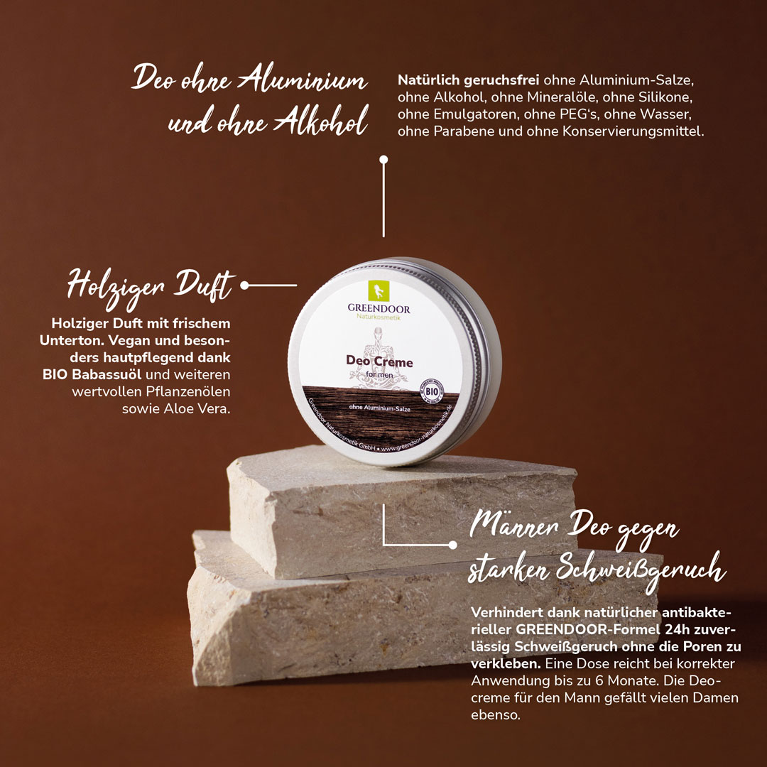 Das GREENDOOR Naturkosmetik Deo für Männer kommt ohne Aluminiumsalze und ohne Alkohol aus. Das feste Cremedeo läßt deine Haut atmen, absorbiert Schweißgeruch, verklebt nicht die Poren und läßt dich den ganzen Tag nicht im Stich. Fest versprochen - auch wenn deine Achseln nicht rasiert sind.