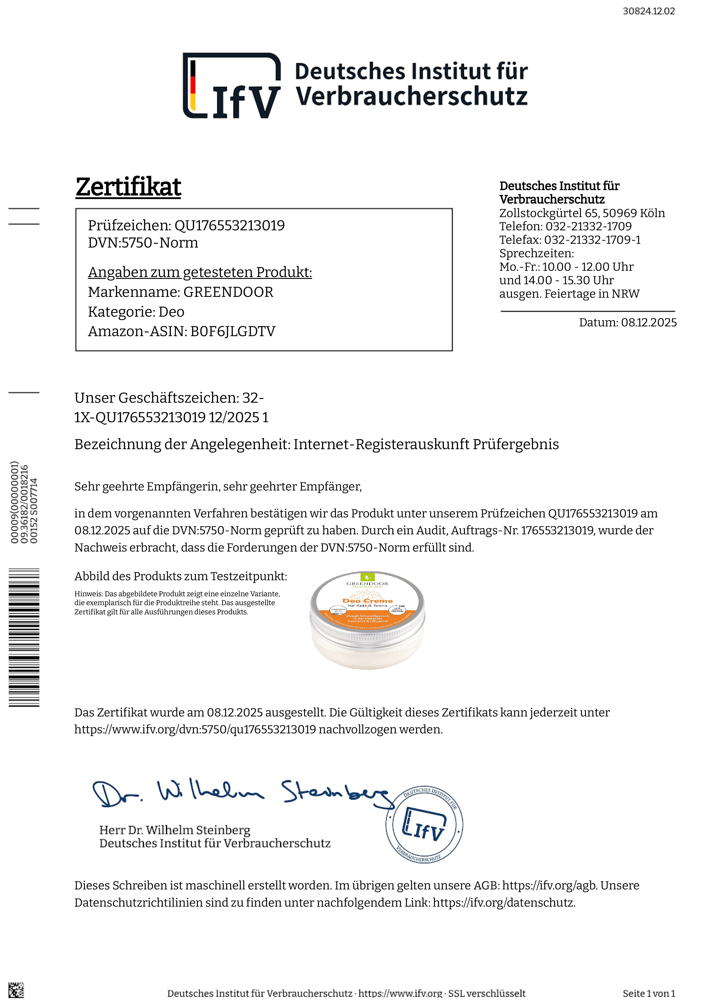 - zertifiziert von Peta e.V (also ohne Tierversuche bei GREENDOOR)
