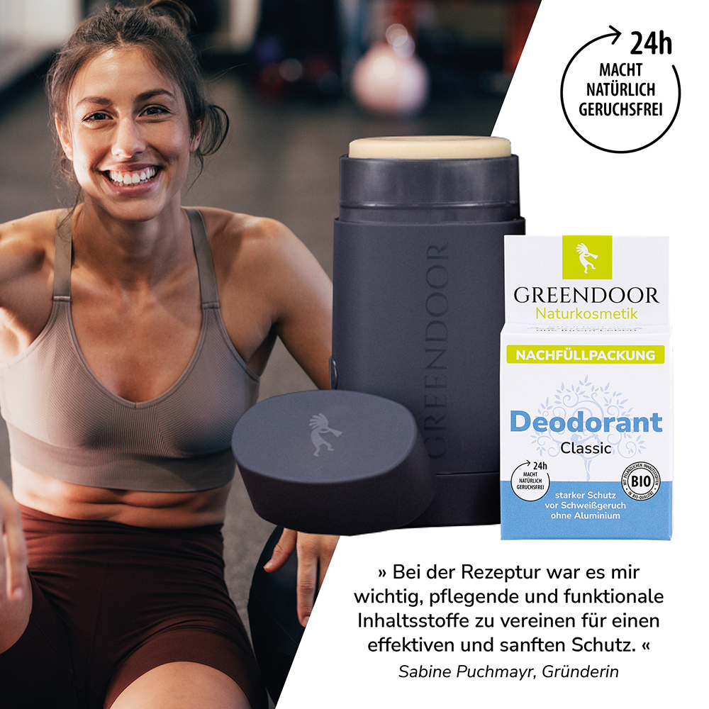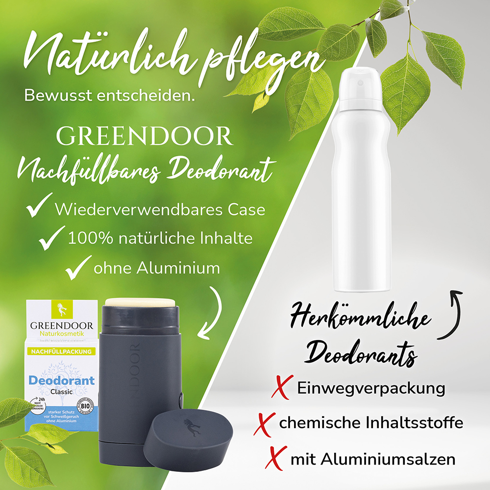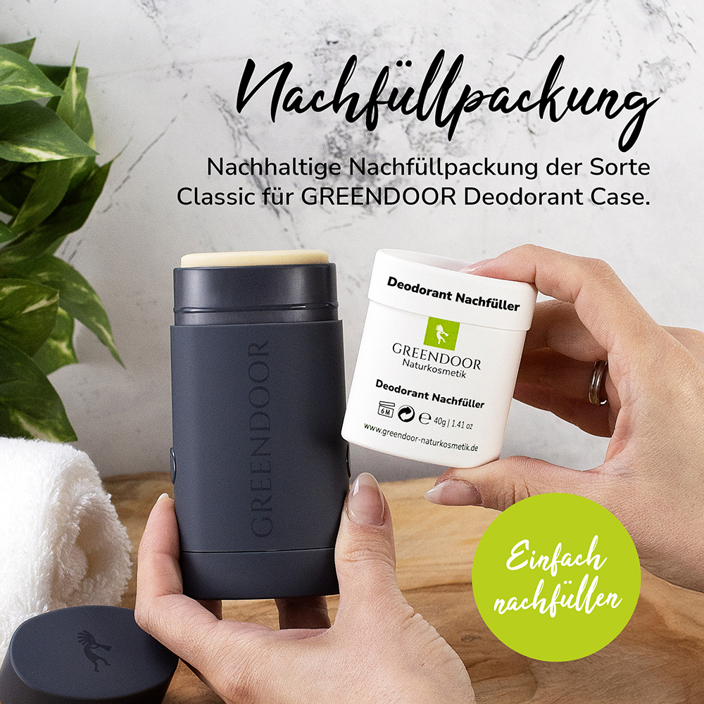 Du erhälst: 1 Nachfüller Deodorant classic (funktioniert nur mit einem bereits vorhandenen GREENDOOR Deodorant Nachfüllsystem)
