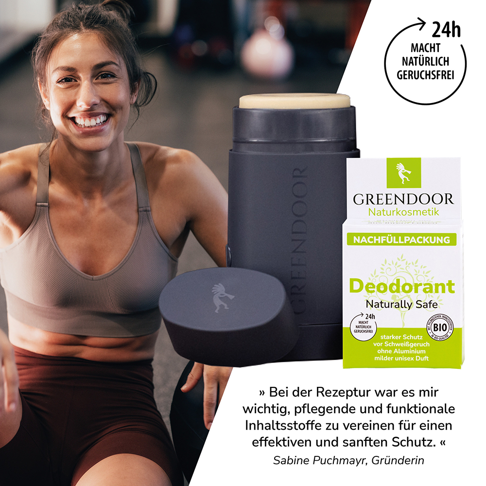 Du erhälst: 1 Nachfüller Deodorant naturally safe (funktioniert nur mit einem bereits vorhandenen GREENDOOR Deodorant Nachfüllsystem)
