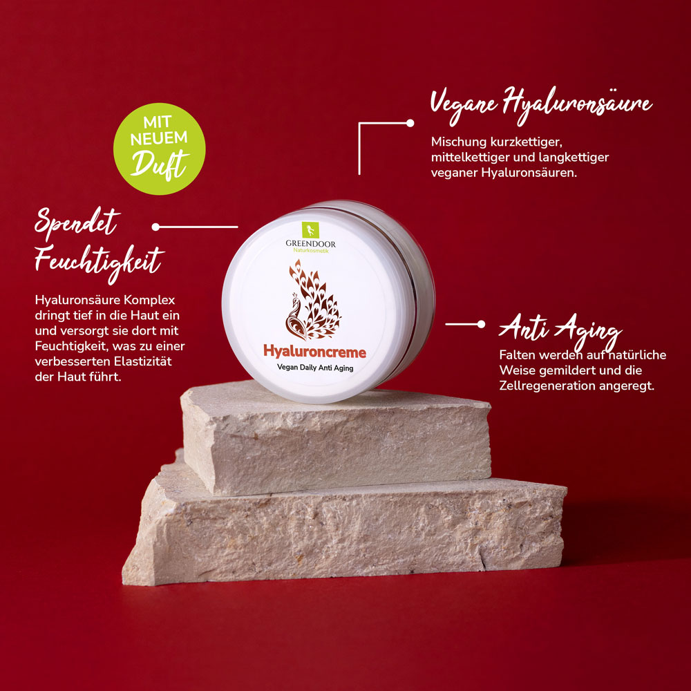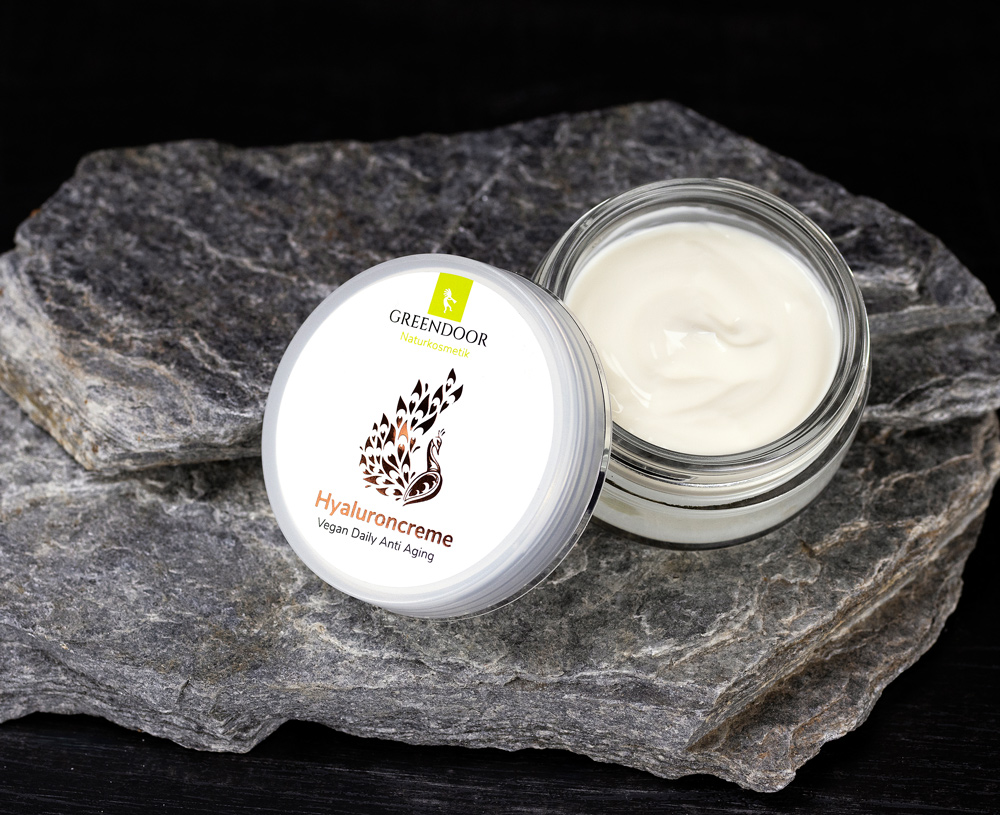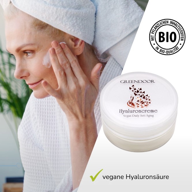 Hyaluronsäure ist ein natürlicher Bestandteil elastischer Haut, sie bindet sehr viel Wasser, daher spricht man auch vom Hyaluron Filler, da bereits wenig Hyaluron einen Falten füllenden Effekt hat. Wissenschaftliche Studien belegen: Unsere Haut beginnt ab 25 Jahren zu altern, es werden Kollagene und natürlich vorhandenes Hyaluron langsam aber stetig abgebaut. Der GREENDOOR Hyaluronsäure Komplex, insbesondere die niedermolekulare Hyaluronsäure, dringt tief in die Haut ein, bildet neue Hyaluronsäure Depots und versorgt sie von innen mit Feuchtigkeit. Die Wasserbindung der Hyaluronsäure polstert deine Haut daher von innen auf. Fülle deine natürlichen Hyaluronsäure Depots wieder auf - mit der veganen GREENDOOR Hyaluron Creme.