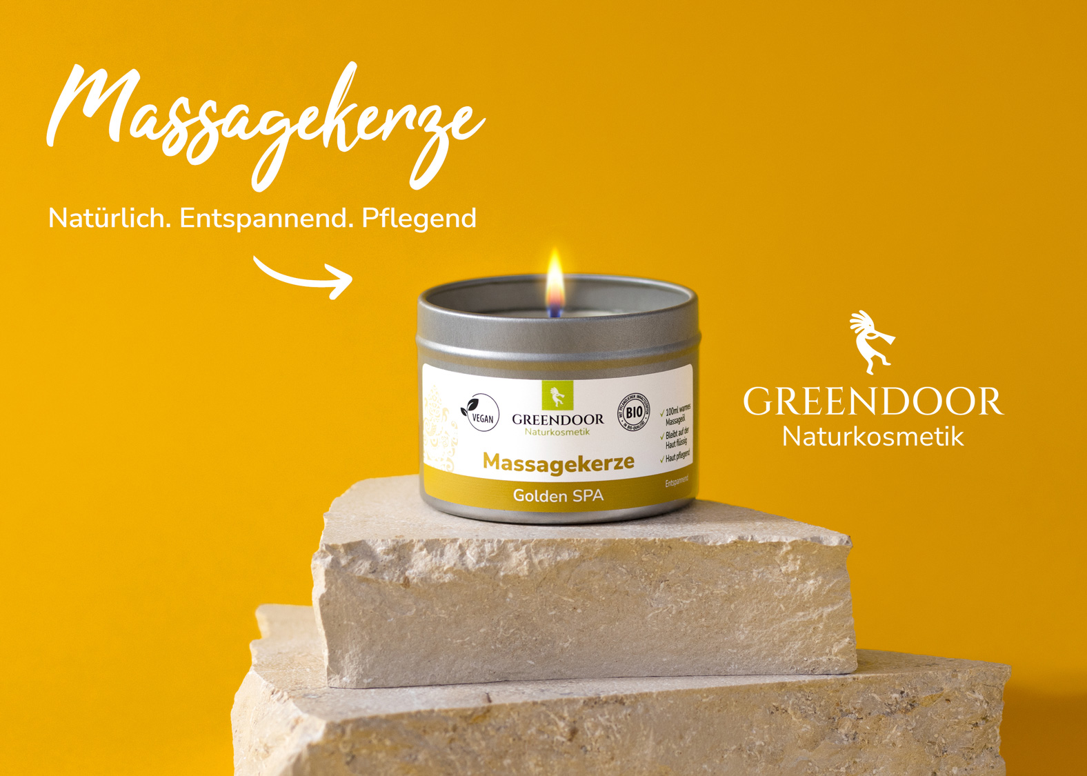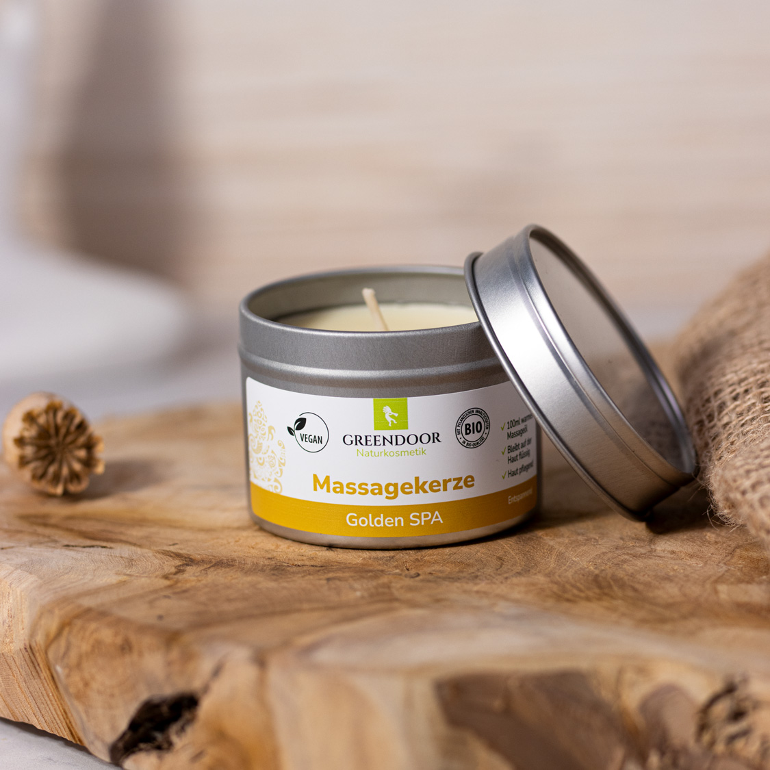 Eine Massagekerze ist Massageöl in fester Form. Der Docht erhitzt das Wachs genau so, dass es in geschmolzener Form in passender Temperatur vorliegt - zumindest bei GREENDOOR. Denn nur die richtige Mischung von Pflanzenwachsen und Ölen funktioniert perfekt. Dazu gehört auch, dass das flüssige Massagewachs auf der Haut nicht wieder fest werden kann. Magie? Nein, Physik.