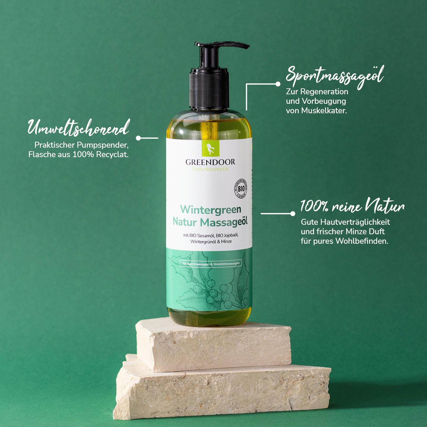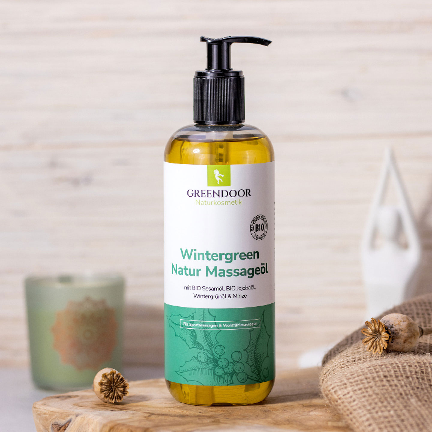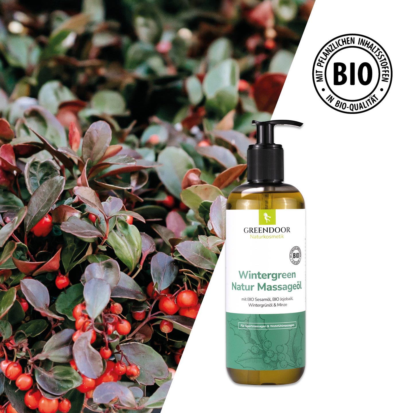 Greendoor Massageöl Wintergreen enthält zur Abrundung zusätzlich zum Wintergrünöl eine vitalisierend anregende Mischung weiterer reiner natürlicher ätherischer Öle.