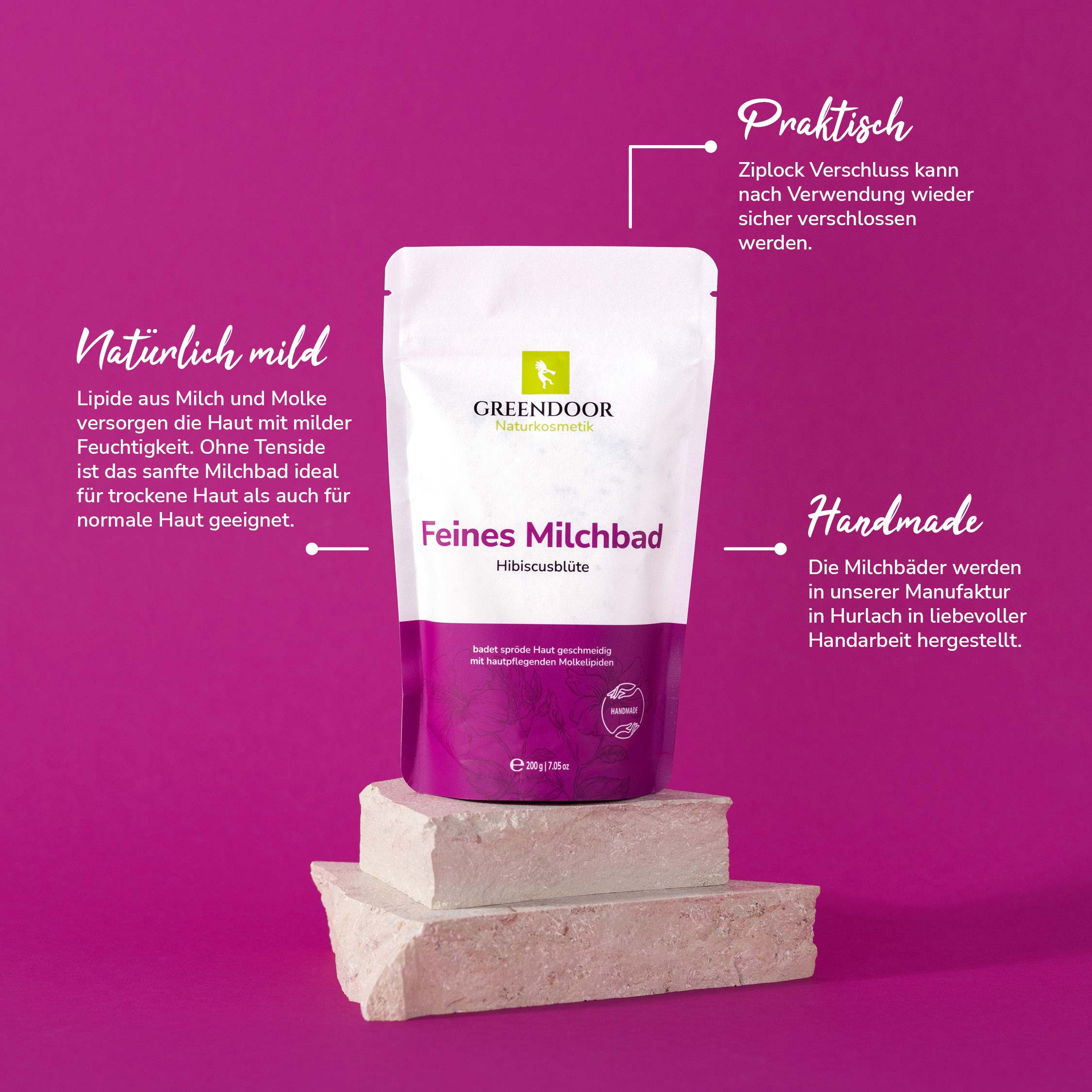 Edle Hibiscusblüten, Milch, Molke und französisches Meersalz umschmeicheln Ihre Haut und machen Sie zart und weich. Der feine, blumige Duft lässt Dich dieses Milchbad besonders genießen und Deine Seele baumeln. So kannst Du entspannen und Deine Haut wird dabei von unserem feinen Milchbad Hibiscusblüte sanft gepflegt.