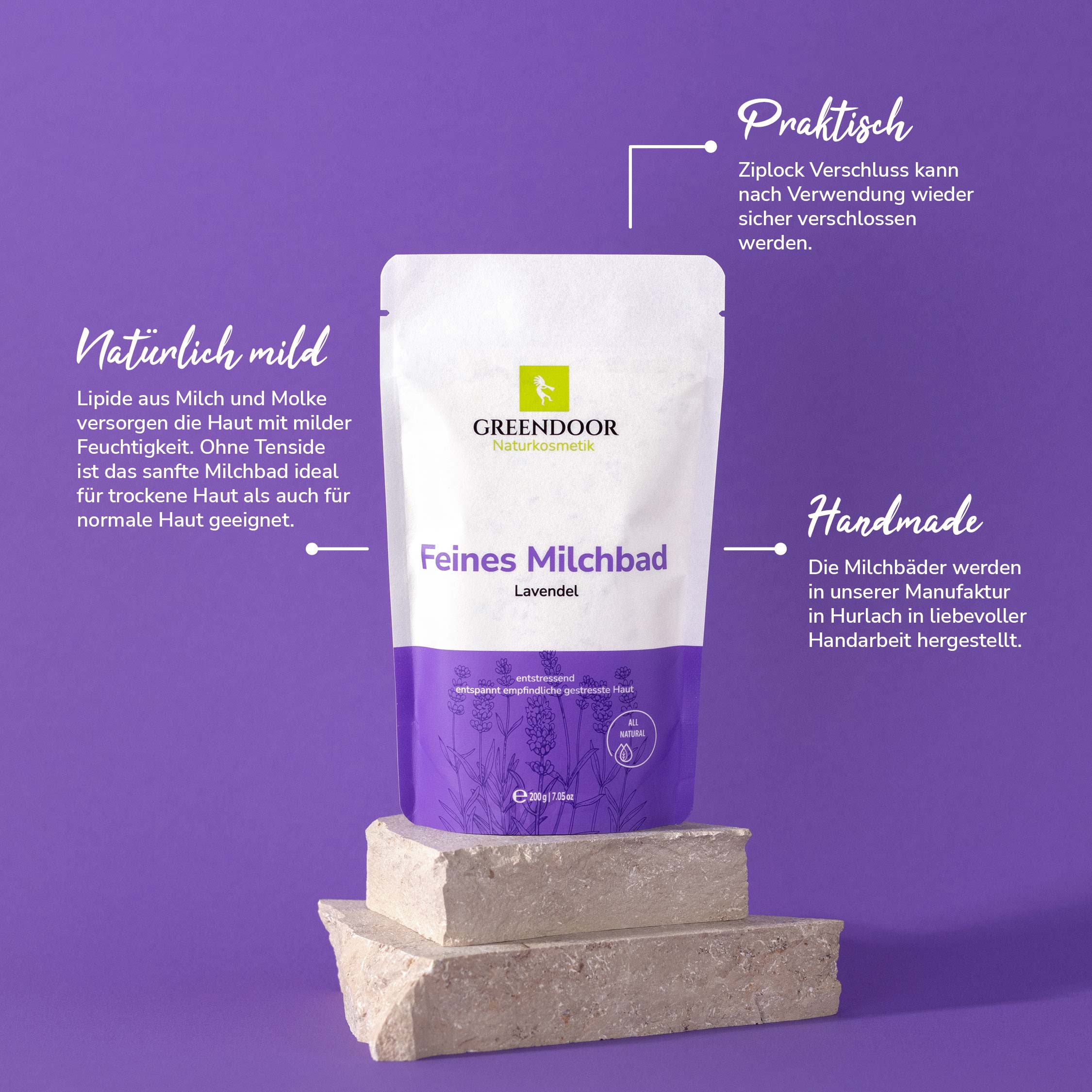 NEU: Die Milchbäder werden ab sofort von uns in einem praktischen Doypack abgefüllt. So sparen wir 75% Verpackung gegenüber der bisherigen Verpackung ein. Die Doypacks können durch den Ziplock Verschluss nach Verwendung wieder sicher verschlossen werden.