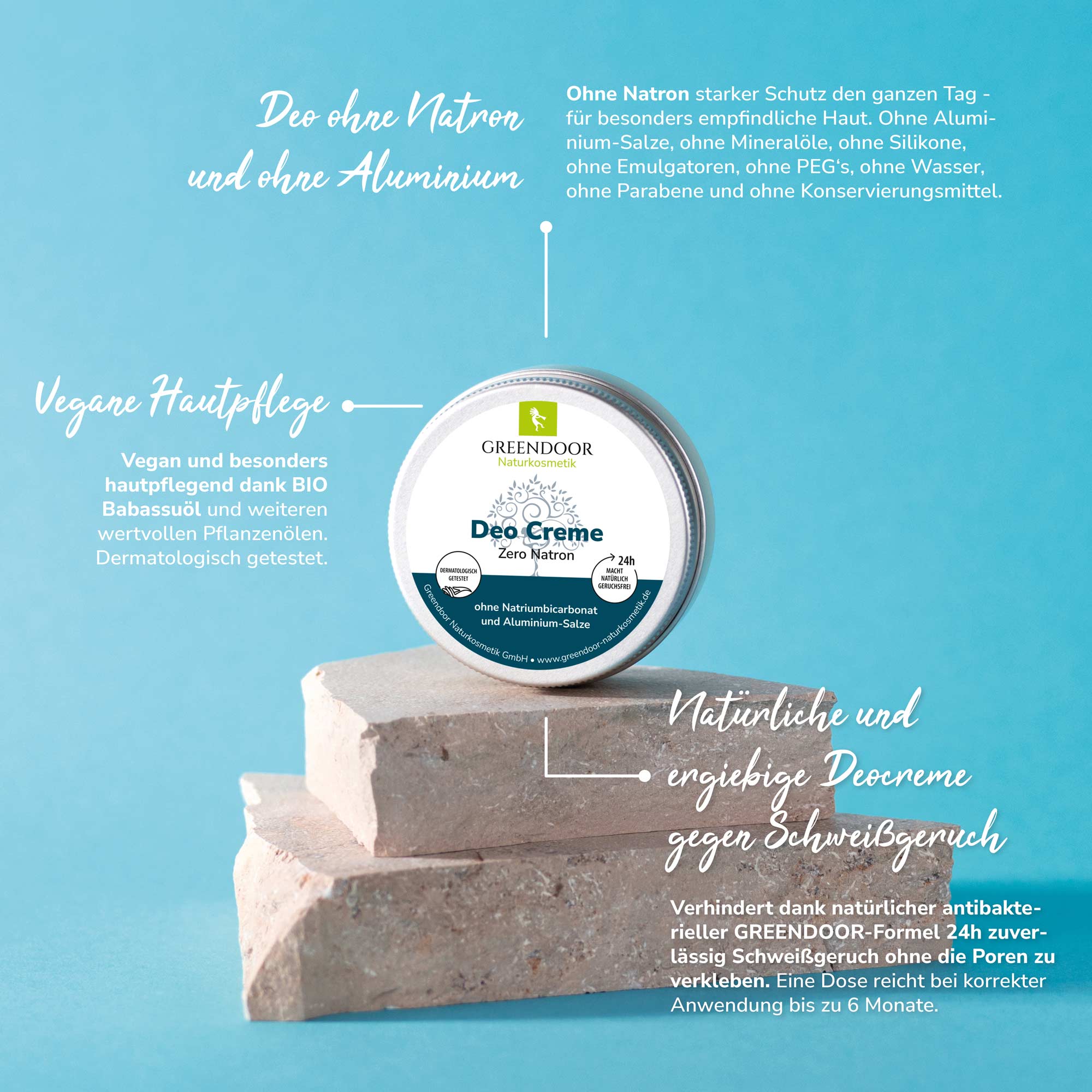 Der pflanzlich-mineralische Rohstoff Komplex schließt Geruchsmoleküle, die bei der Zersetzung von Schweiß entstehen, sicher ein und absorbiert diese. Pflegendes BIO Babassuöl, BIO Sheabutter und Mangobutter sorgen für eine extra zarte Achselhaut. GREENDOOR Deo Creme Zero Natron wirkt desodorierend, verhindert dabei nicht die natürliche Transpiration, die Haut kann normal atmen.
