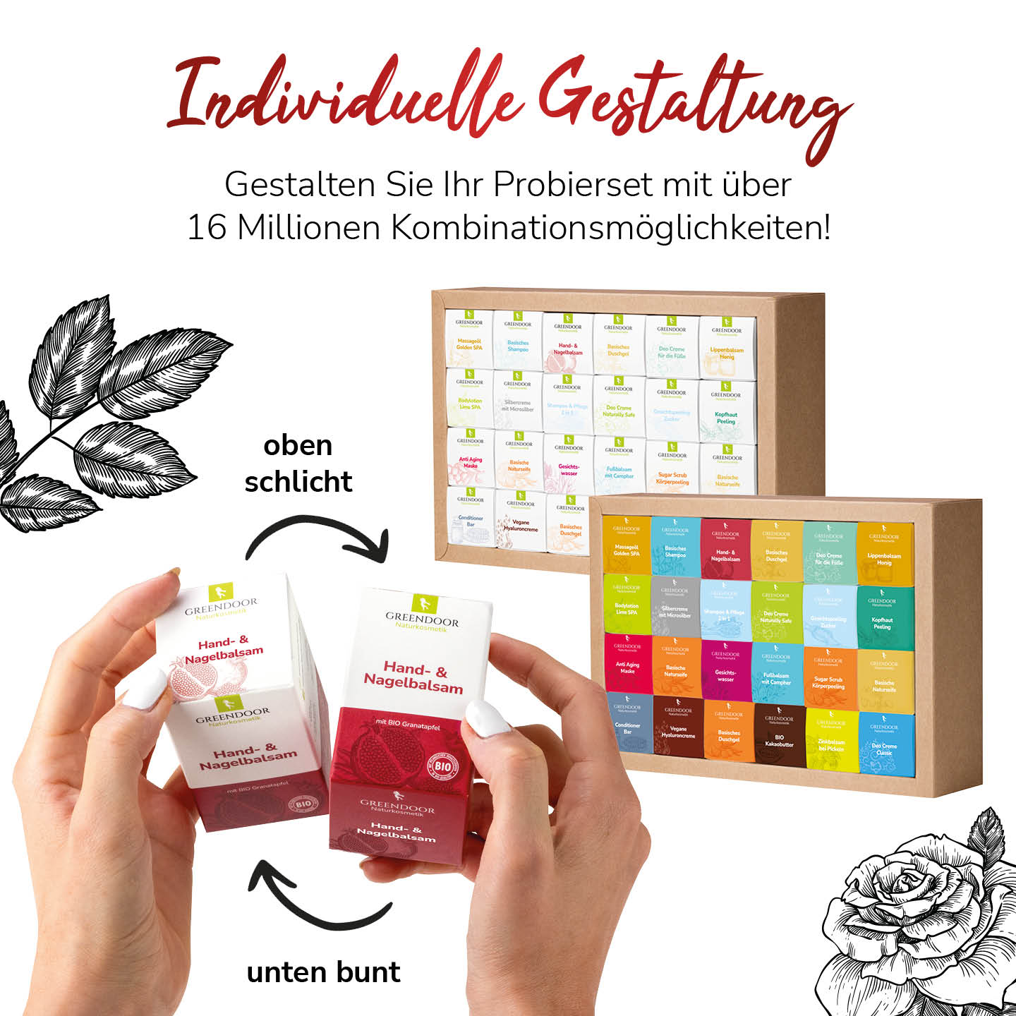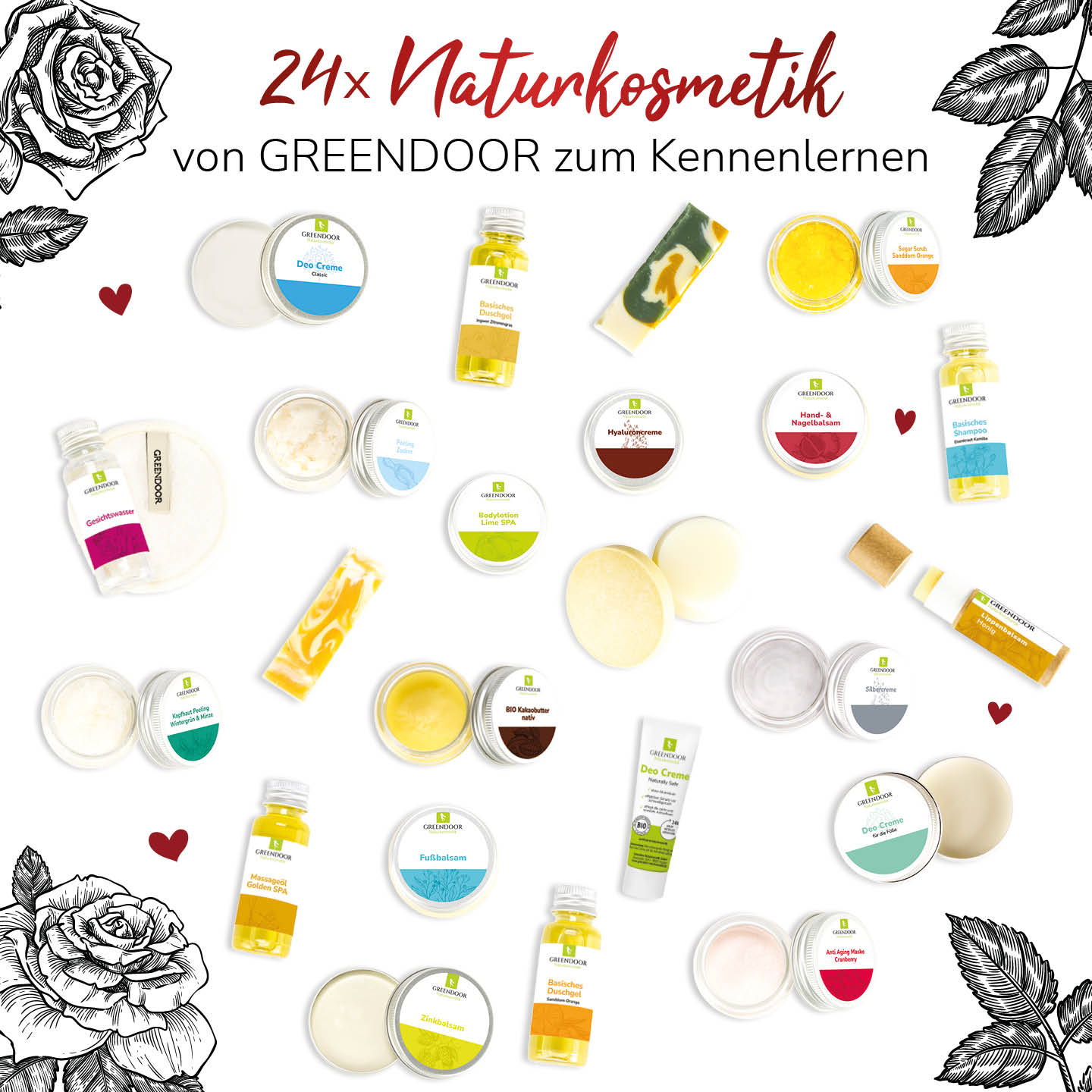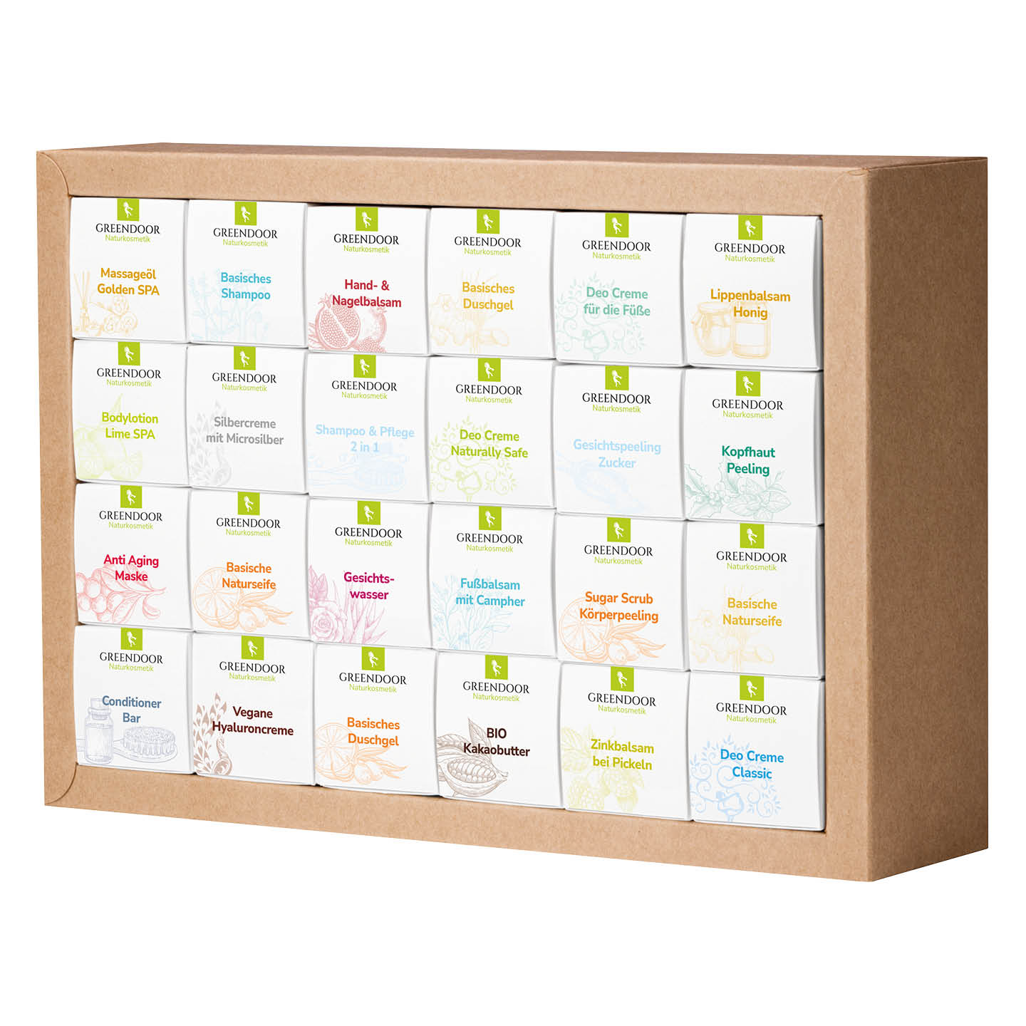 Dieses einzigartige Set als Geschenk für Sie oder Ihn ist gefüllt mit 24 natürlichen Pflegeprodukten von GREENDOOR Naturkosmetik in praktischer Probier-/Reisegröße – unser Geschenk Set umfasst eine Vielzahl ausgewählter Produkte, die nicht nur die Sinne ansprechen, sondern auch die Haut verwöhnen. Von duftendem Rosenwasser für die natürliche Gesichtspflege, über pflegende Massageöle bis hin zum pflegenden Bio-Lippenbalsam werden Sie garantiert Ihr nächstes Lieblingsprodukt von GREENDOOR für sich entdecken.