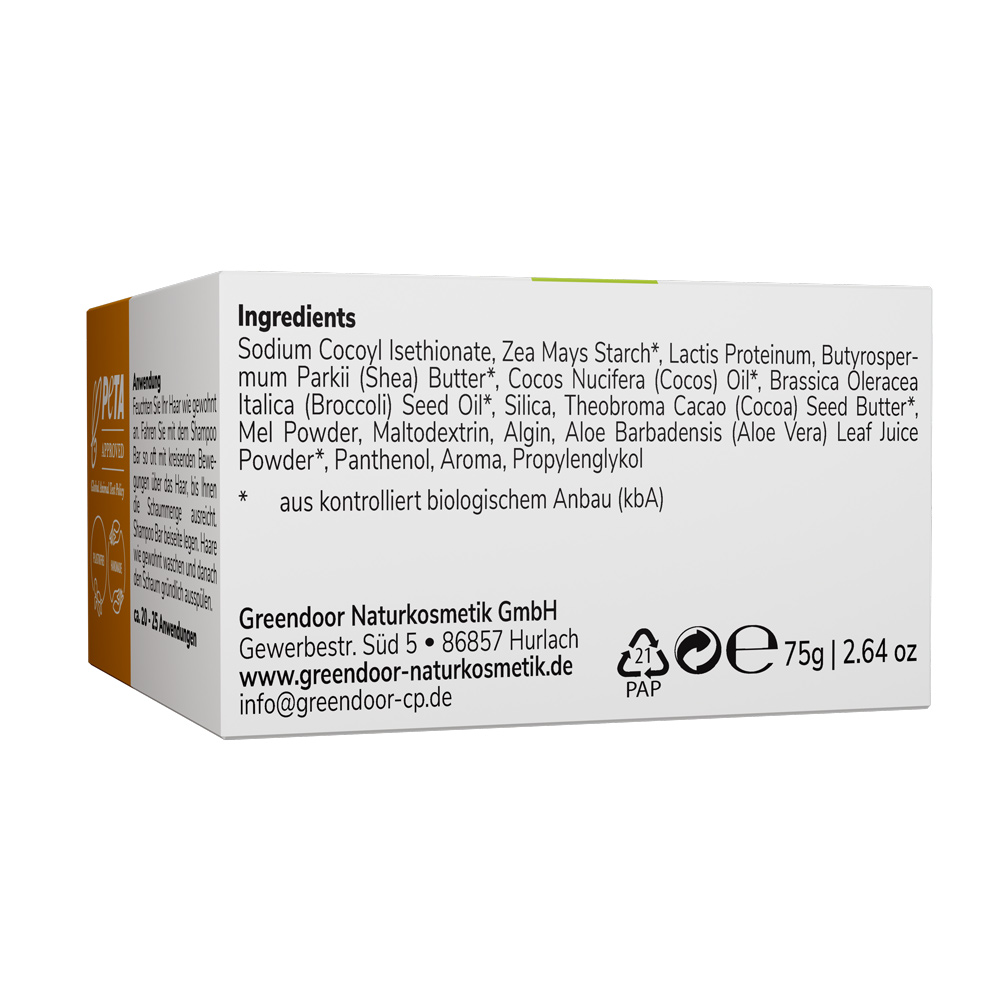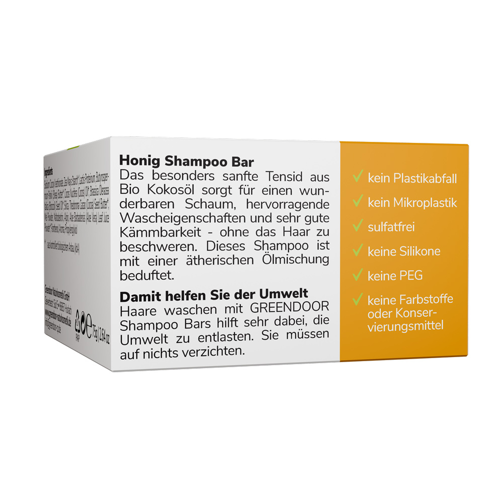 Der GREENDOOR Shampoo Bar Honig liefert deinem Haar konzentrierte Haarpflege aus Bio Sheabutter, Bio Brokkolisamenöl, Bio Kakaobutter, Bio Kokosöl, Molke, Aloe Vera und echtem Bienenhonig. Dieses Haarshampoo ist ohne Wasser, ohne Konservierungsmittel, ohne Sulfate, ohne PEG's, ohne Emulgatoren, ohne Plastik und ohne Silikone.