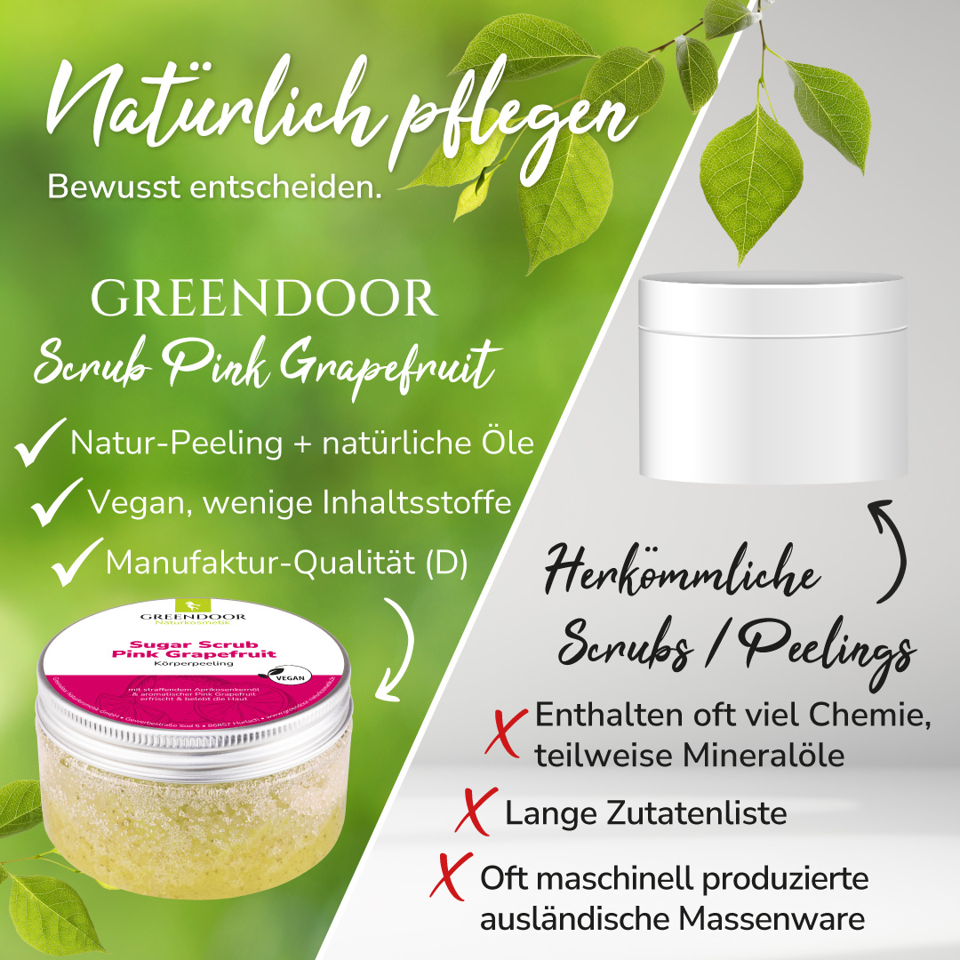 Der GREENDOOR Sugar Scrub Pink Grapefruit ist ein Muss für Liebhaber fruchtiger herber Frische. Er kombiniert den Duft frischer Florida Grapefruits mit definierten Zuckerkristallen als Peeling-Mittel und besonders pflegendem, wertvollen Aprikosenkernöl. Ihre Haut wird von abgestorbenen Hautschüppchen befreit und gleichzeitig intensiv gepflegt und genährt.