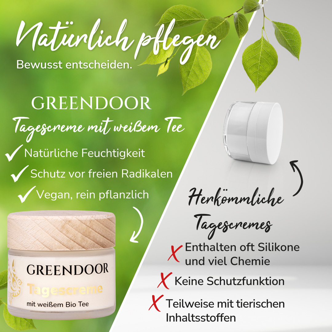 GREENDOOR vegane Tagescreme mit weißem Bio Tee schützt und strafft deine Haut und spendet ihr nachhaltig natürliche Feuchtigkeit. Sie schützt vor vorzeitiger Hautalterung - Angriffe freier Radikale, ausgelöst durch UV-Strahlung und Umweltverschmutzung, werden abgewehrt. Die Zellen sind geschützt, die Haut kann sich in Ruhe erneuern und reparieren.