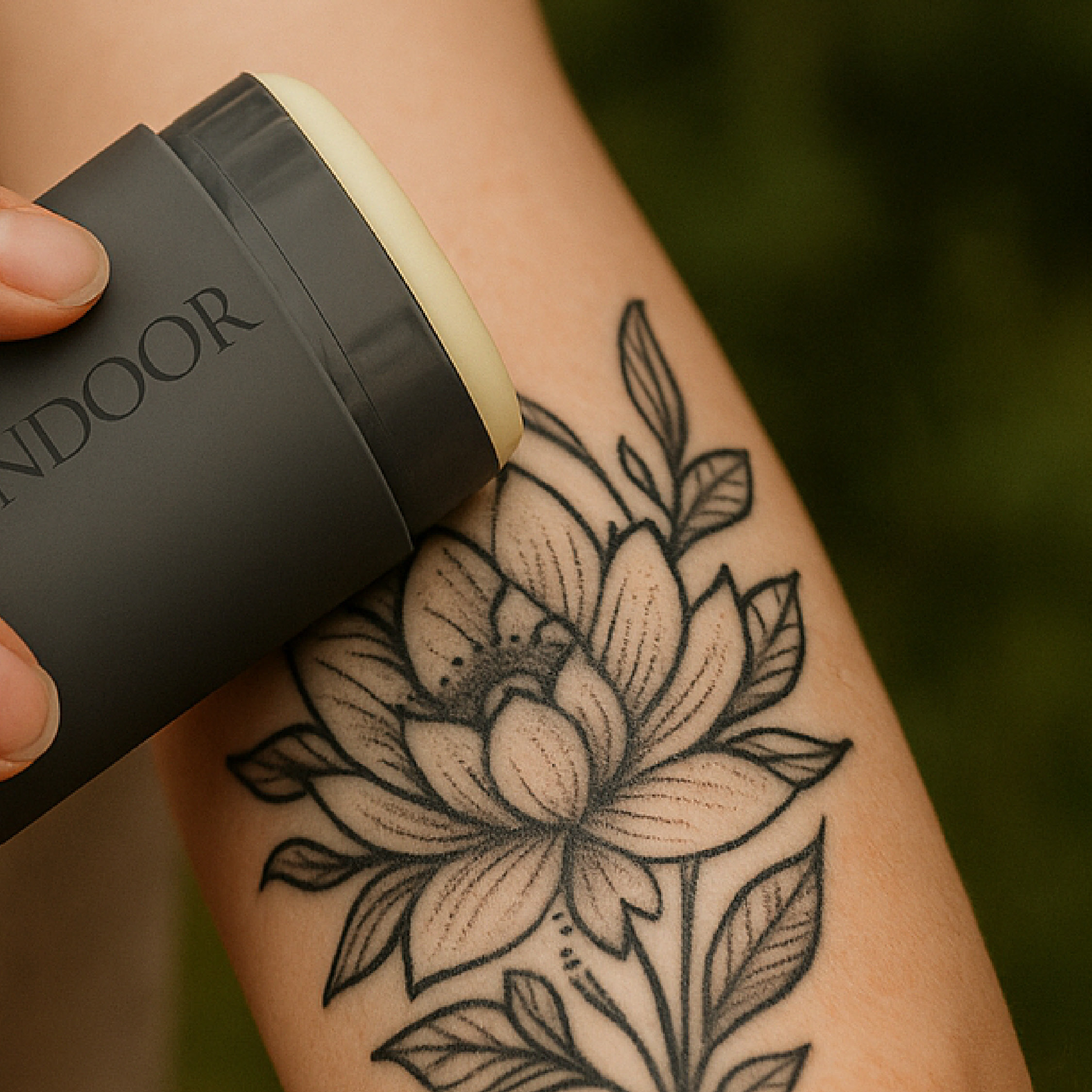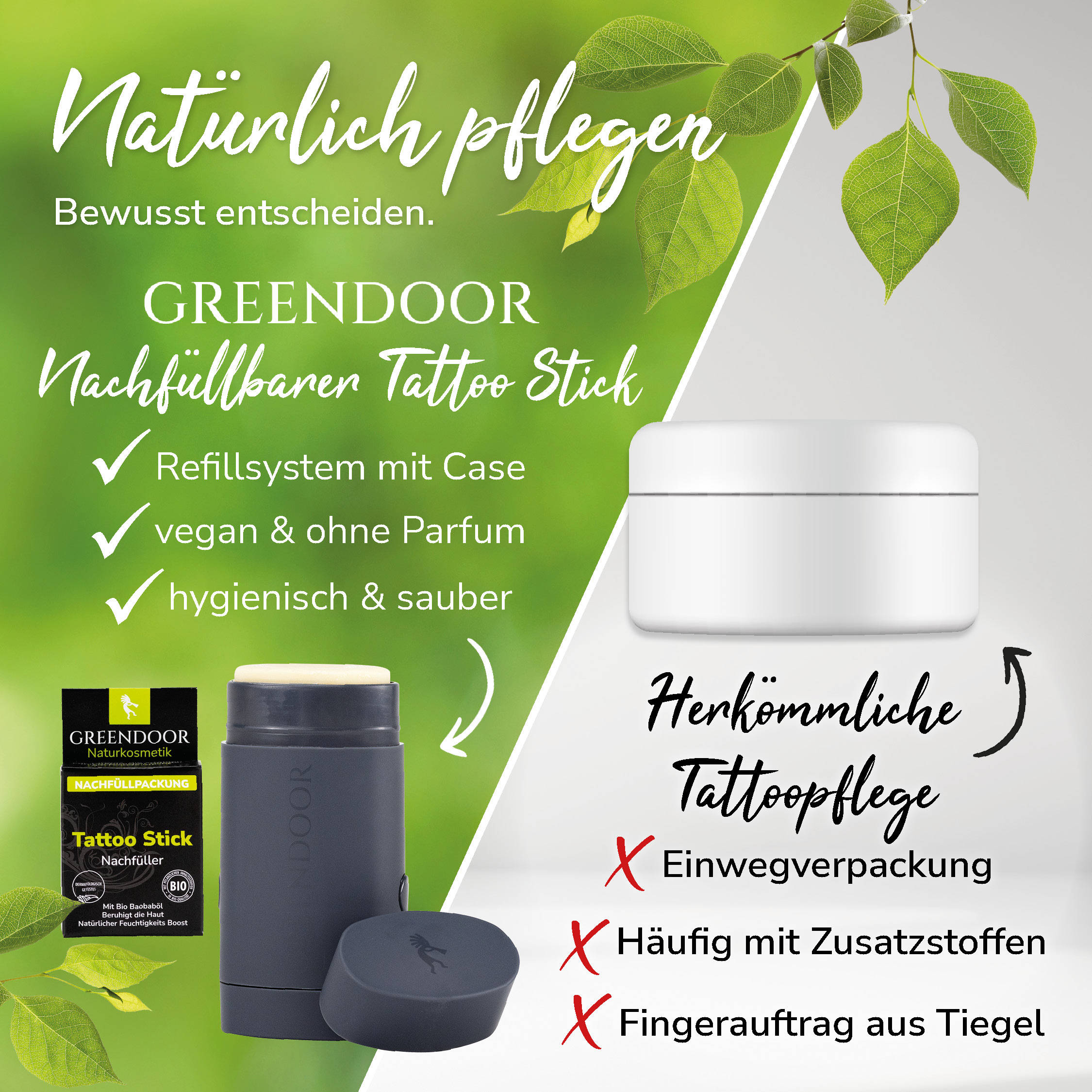 Alles, was du dafür tun musst, ist deine Tattoos mit der richtigen Mischung natürlicher bester pflanzlicher Öle und Buttern zu pflegen. Entdecke dafür das GREENDOOR Tattoobutter Nachfüllsystem – die perfekte Kombination aus modernem stilvollem Design, Top Pflege vom Naturkosmetik Spezialisten, Hygiene und Umweltbewusstsein. Diese innovative Tattoopflege mit Bio Babassubutter setzt neue Maßstäbe in der nachhaltigen Tattoopflege.